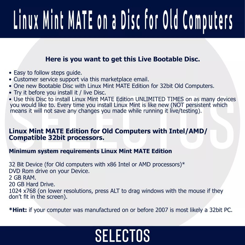 SELECTOS Linux Mint 19.3 Tricia MATE Edition Live CD Bootable DISC for Old 32bit Computer
