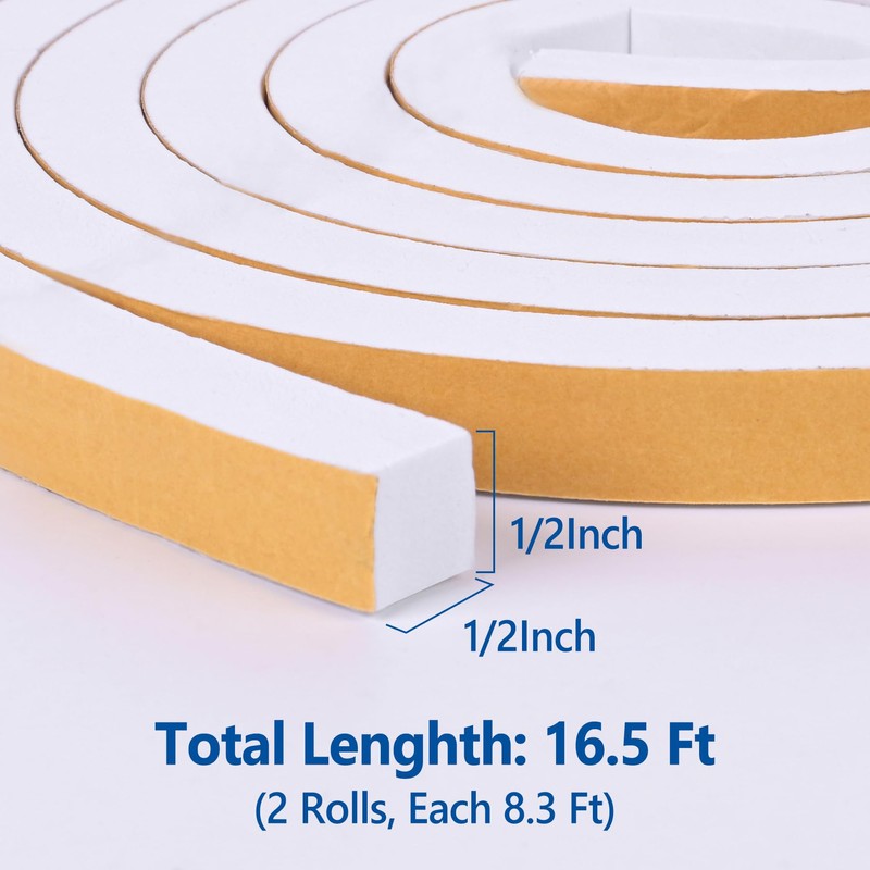 Self Adhesive Foam Tape Weatherstrip 1/2in x 1/2in x 16.5Ft High Density Foam Insulation Strips Foam Seal Weather Stripping with Strong Adhesive for Door and Window Sound Isolation Soundproofing