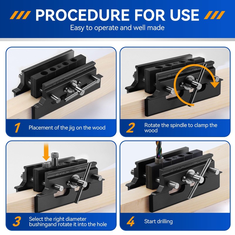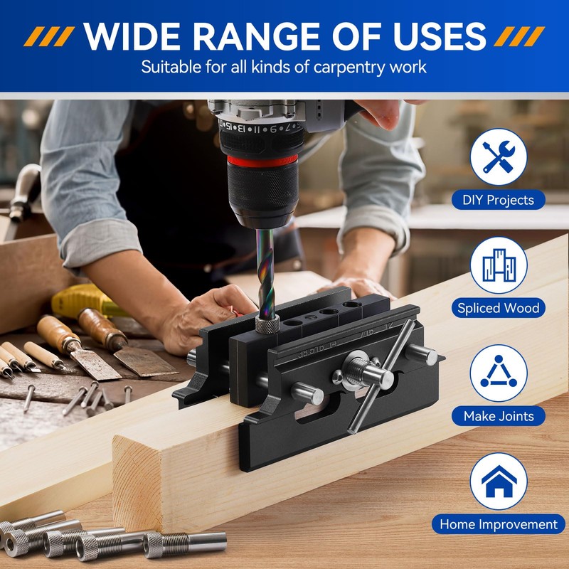 • 【PROFESSIONAL PRODUCT DESIGN】: We offer a complete set of self-centering tenon jig and 6 drill sleeves. The stainless steel drill bushings are 1/4“ & 3/8” & 5/16" respectively. The purpose of the drilling bushings is to avoid the friction of the drill bit from damaging the inside of the hole. 7/16“ and 1/2” holes have a smooth inside and can be drilled directly with the drill bit without the use of the drilling bushings.