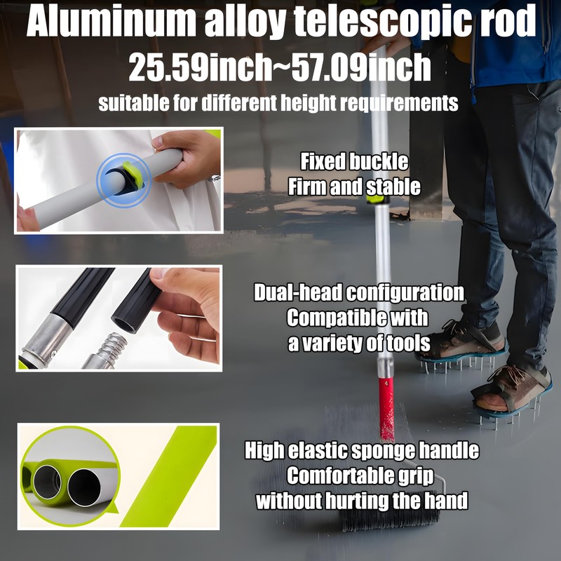 - 【25.59-57.09-inch aluminum alloy telescopic rod】Equipped with a telescopic aluminum alloy rod with a length range of 25.59 to 57.09 inches. The rod body is light and durable, and the length can be freely adjusted to adapt to different construction heights and reduce bending fatigue. The universal interface can quickly connect spiked rollers, leveling rakes and paint rollers, which is easy to switch and greatly improves construction efficiency and operating comfort.