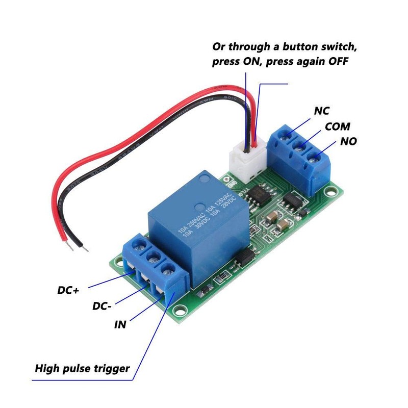 - TIP: Or through a button switch, press the relay ON, and press again,the relay is OFF.