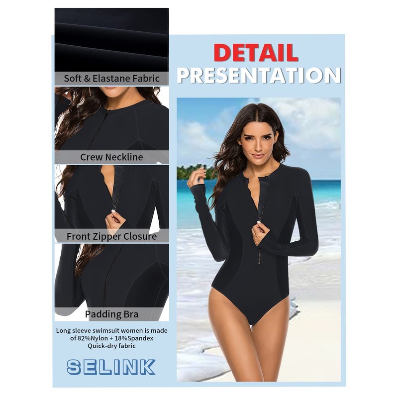 SELINK Women's Long Sleeve Rash Guard UV Protection Zipper Printed Surfing One Piece Swimsuit Bathing Suit Pure Black L