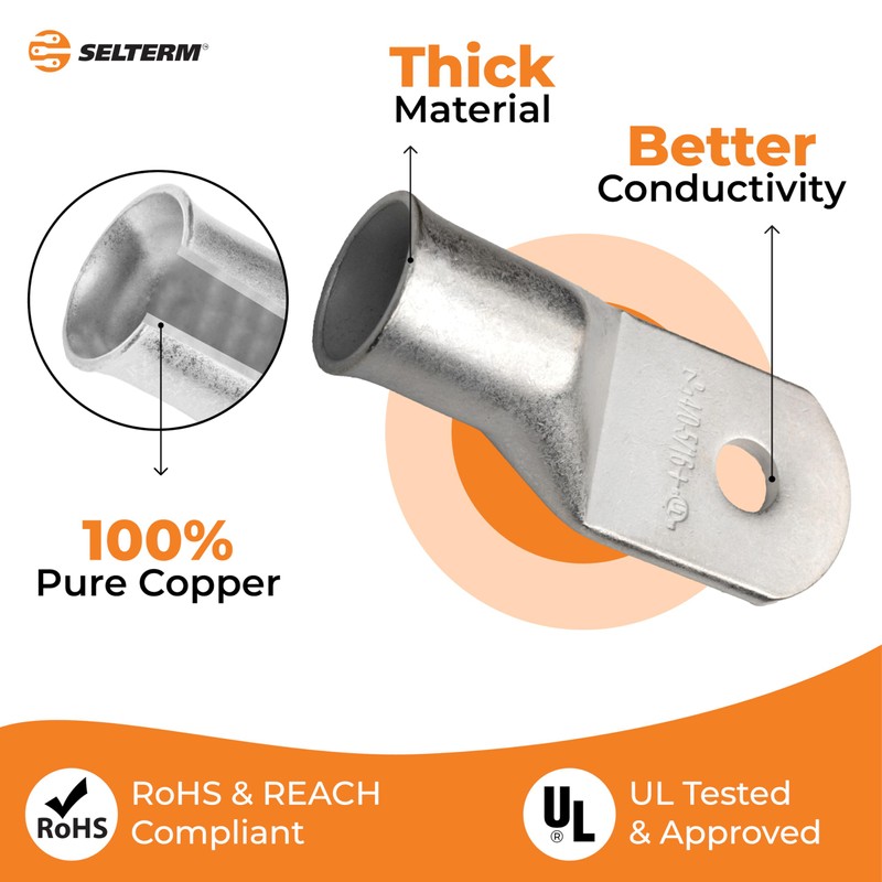 - Secure and Reliable Connections: Ensure strong and dependable battery connections with Selterm 4/0 AWG (XL) Ring Terminal Connectors. Approved by OEMs, our Tinned Copper wire ring connectors are corrosion free; ideal for marine, automotive or outdoor use; salt spray tested to ASTMB117 standard. Special matte tin plating make these lugs as easy to Solder as it is to Crimp.