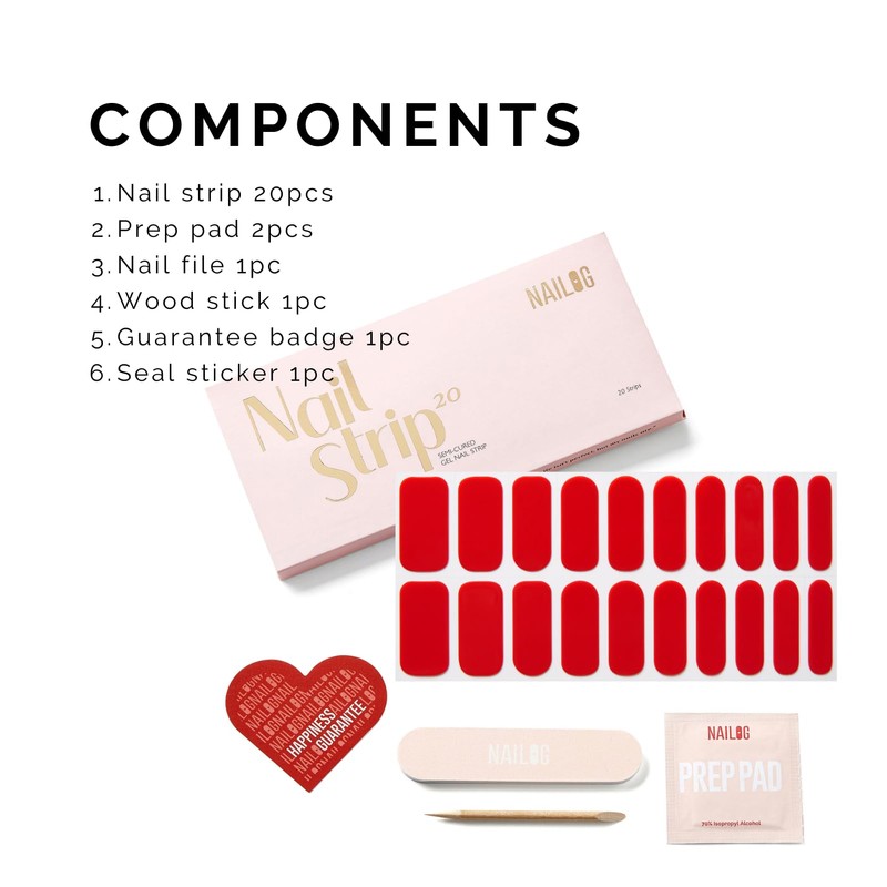 NAILOG gel nail strip is the latest type of nail strip that is made of real gel liquids which is semi-cured. It's much better than plastic stickers or acrylic nails in terms of comfort of wearing, and it gives the salon-quality spherical thick and glossy finishing peculiar to gel nail. Each NAILOG kit includes 20 pieces of double ended extra-long strips in 10 sizes, 1 piece of nail stick, 1 piece of nail file, and 2 pieces of prep pads.