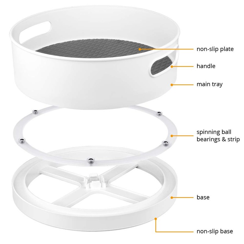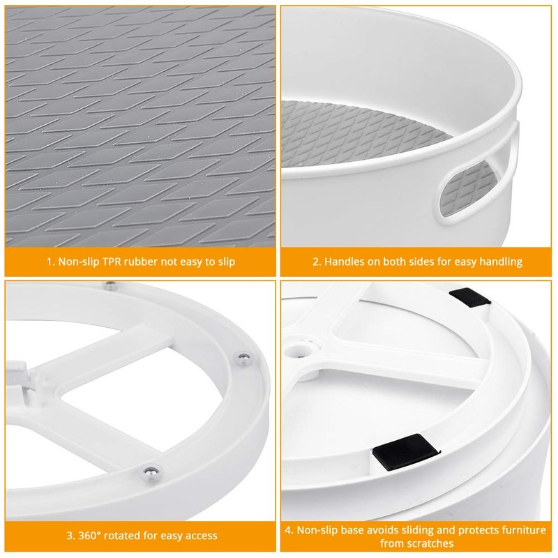 - Non-Slip Surface And High Edges: Never worry about your items falling off. There are non-slip latex dots on the surface of the lazy susan, the non-skid surface keeps items in place while rotating. The high edge is better than the low edge, because the high edge doesn't need to worry about the jar falling during the spin.