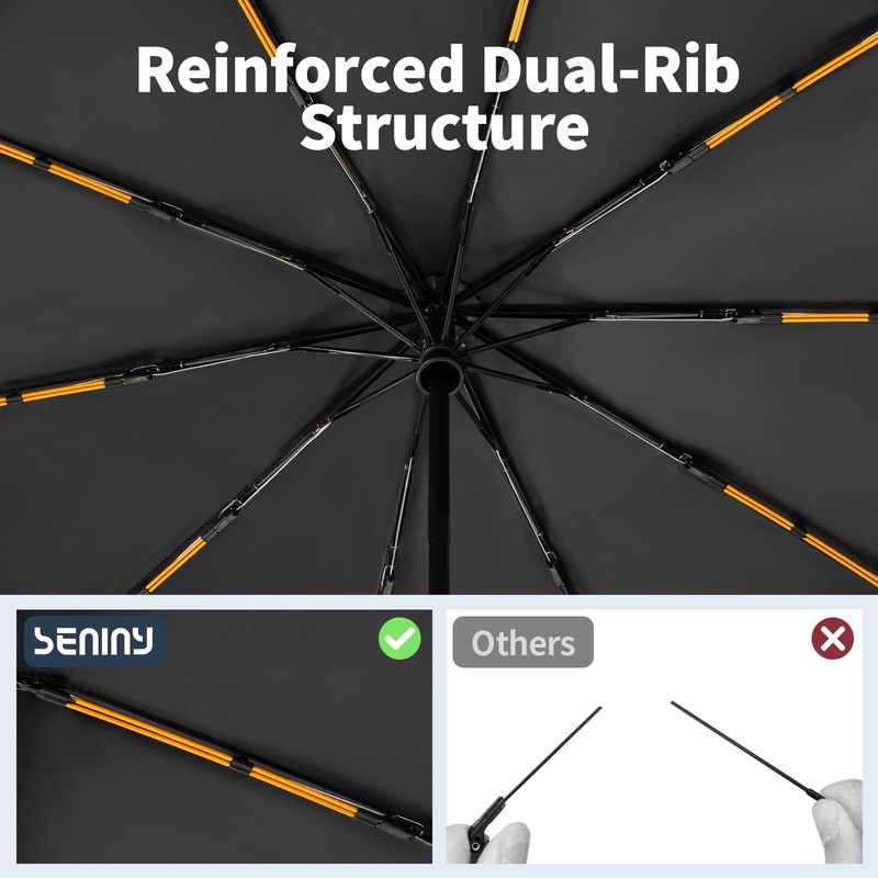 - 【Compact Yet Spacious】Measuring only 14.9" when folded, Seniny windproof umbrella can easily fit into whether your totes, handbags, or briefcases. Coping with the changeable weather at any time! Though compact, this big umbrella comes with a 46.5" canopy, giving ample coverage for 2 people sharing during sudden downpours.