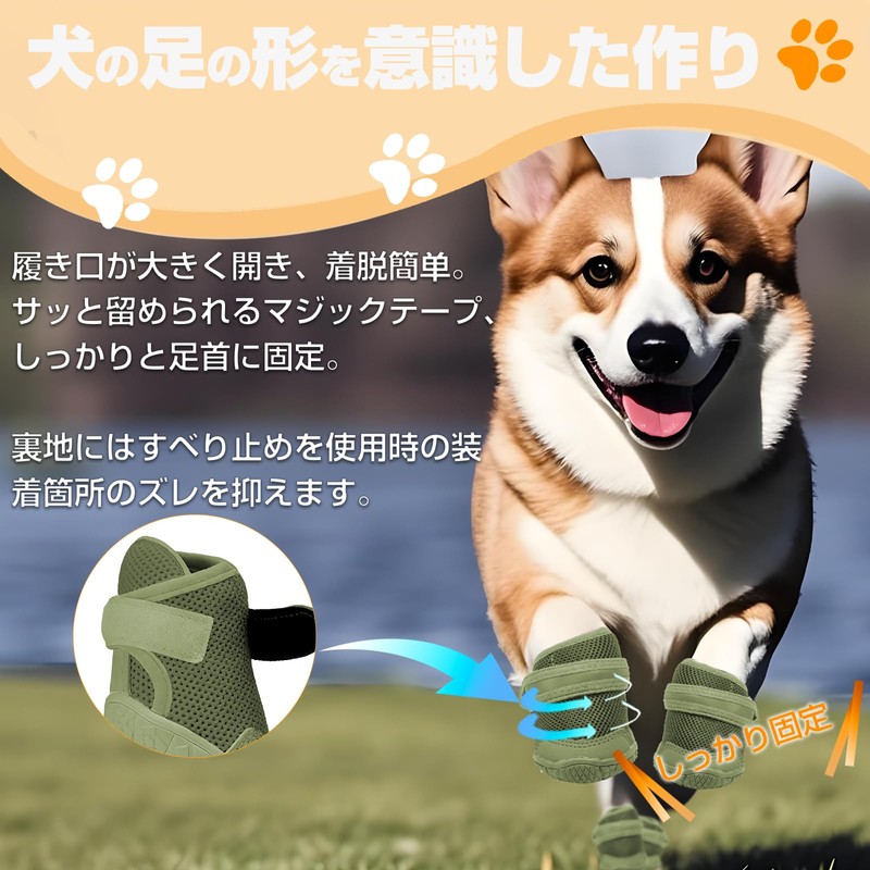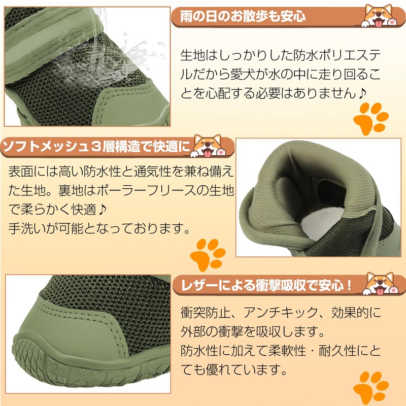 「SENMUUP」犬靴 犬用ブーツ ドッグシューズ 夜間反射テープ付 春夏用 軽量通気 メッシュ 抗菌防臭 吸水速乾 履かせやすい 脱げにくい 肉球保護 滑り止め 耐久性ゴム底 散歩 防水 介護 傷舐め防止 小&中型犬 5サイズ 4個セット (グリーン, 4#)