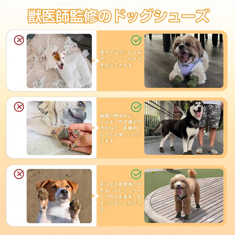 - 【耐久性ゴム底&滑りにくい】厚さ2mmの丈夫なゴム製の靴底が、愛犬の足をしっかり保護。夏のアスファルトの熱による肉球のやけどや冬の冷えから足を守ります。ガラス片や金属片、鋭い枝や草のなどの危険な障害物によるケガも防止します。また滑りにくいゴム製ソールのため足腰が弱って、歩くときに滑ってしまうワンちゃんにもおすすめです。