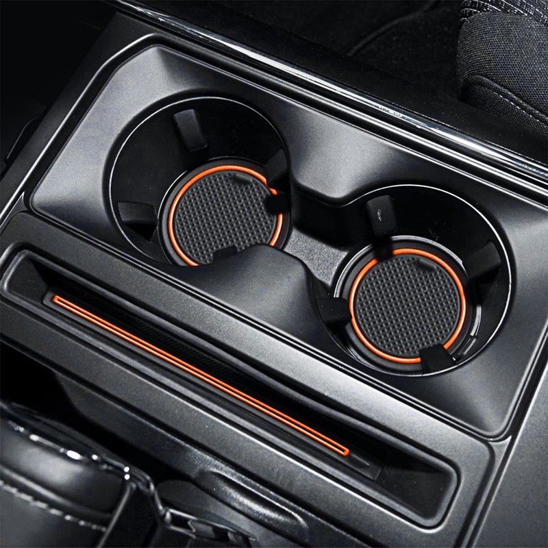 SENSHINE for Ford F150 Accessories 2021 2022 2023 2024 Non-Slip Anti Dust Cup Holder Insert Center Console Liner Trim Door Packet Mats Premium Custom Interior 40-pc Set (Bucket SuperCrew)(Orange Trim)