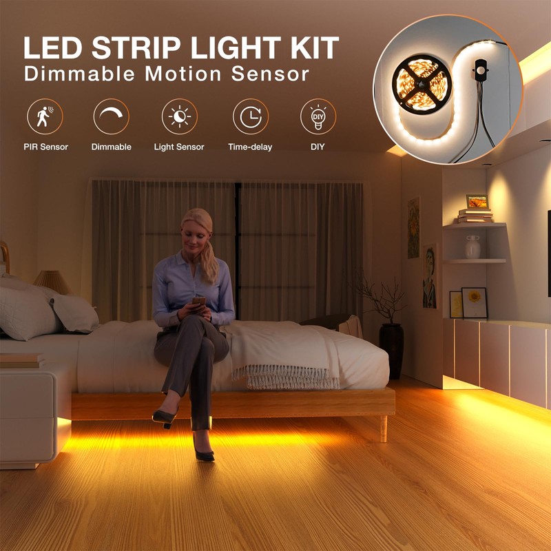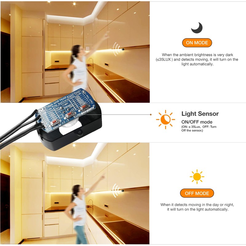 - 【Upgraded Motion Activated Strip Light】Motion Sensor switch turn light on or off by human induction.The latest PIR motion sensor can precisely adjust the light intensity(15% -100%), delay time(15s-30mins) and light sensor(ON/OFF mode) with just push of a button.