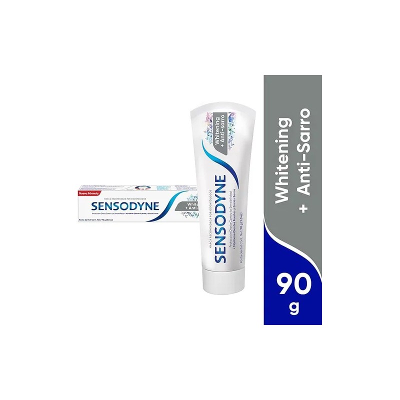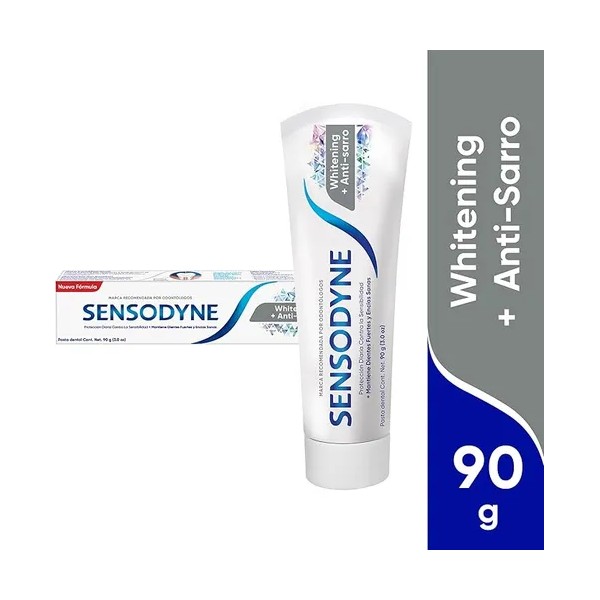 Descripción Limpia: La pasta dental Sensodyne Blanqueadora 2 Pack es la elección ideal para quienes buscan una sonrisa radiante y saludable. Con su fórmula avanzada, no solo ayuda a blanquear los dientes, sino que también combate la acumulación de sarro, proporcionando una limpieza profunda y efectiva. Cada tubo contiene 90 g de crema dental, diseñada para ofrecer una experiencia de cepillado placentera y refrescante.
