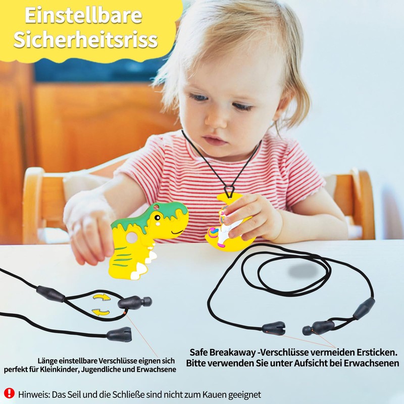 - 6-in-1 sensory chewing necklace: contains dinosaur x 1, moon unicorn x 1, lion x 1, building blocks x 1, shark teeth and duck teething ring. These pendants are uniquely shaped and easy for baby to grip. They are moderately hard to ensure they do not hurt baby's teeth and gums. In addition, they effectively relieve baby's pain when teething.