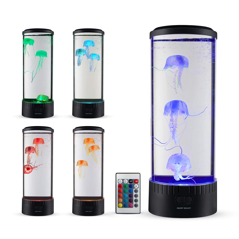 - A DELUXE JELLYFISH LAVA LAMP FOR THE KIDS IN YOUR FAMILY. Now with a larger water tube, 3 big glowing jellyfish, a 20-color option remote, and a mini ocean wave projector, our new SensoryMoon hypnotic jellyfish aquarium is perhaps the best in the market! Your children will watch the electric jellyfish mood lamp in awe as the fake jelly fish spring to life via undetectable water currents, slowly swimming in a captivating yet relaxing way, and glowing in response to a colorful LED backdrop.