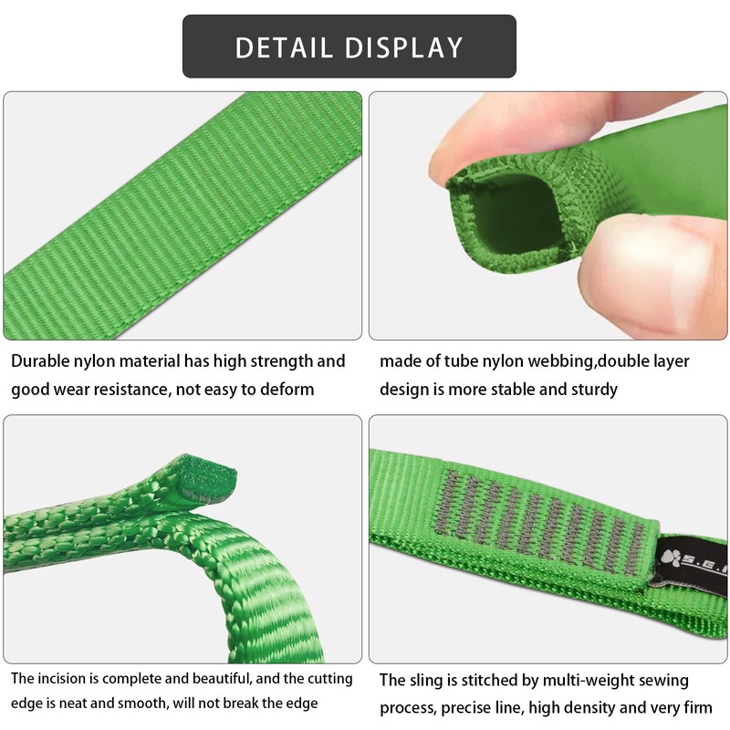 - Various Activities: Nylon loop runners are very suitable for line redirections, speed-line systems and often used to connect ATC during rock climbing and descent, or to secure the user to a protective station in multiple sections. It can be used for tree trimming, positioning, rigging, ziplining, anchoring, climbing, hanging, stretching, bundling, saddle hunting, hammock, and can also be used for extending positioning ropes. Its multifunctional use is loved by arborist, line worker, mountaineer.