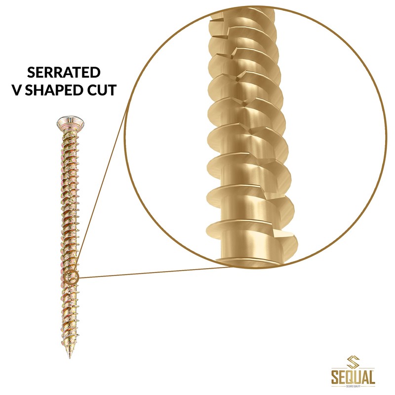 • DEEP HIGH/LOW THREAD: These masonry screws have a deep high/low thread for high pull out resistance. The high-low serrated V-threads of the concrete screws ensures efficient debris removal which creates a firm hold in most common substrates.