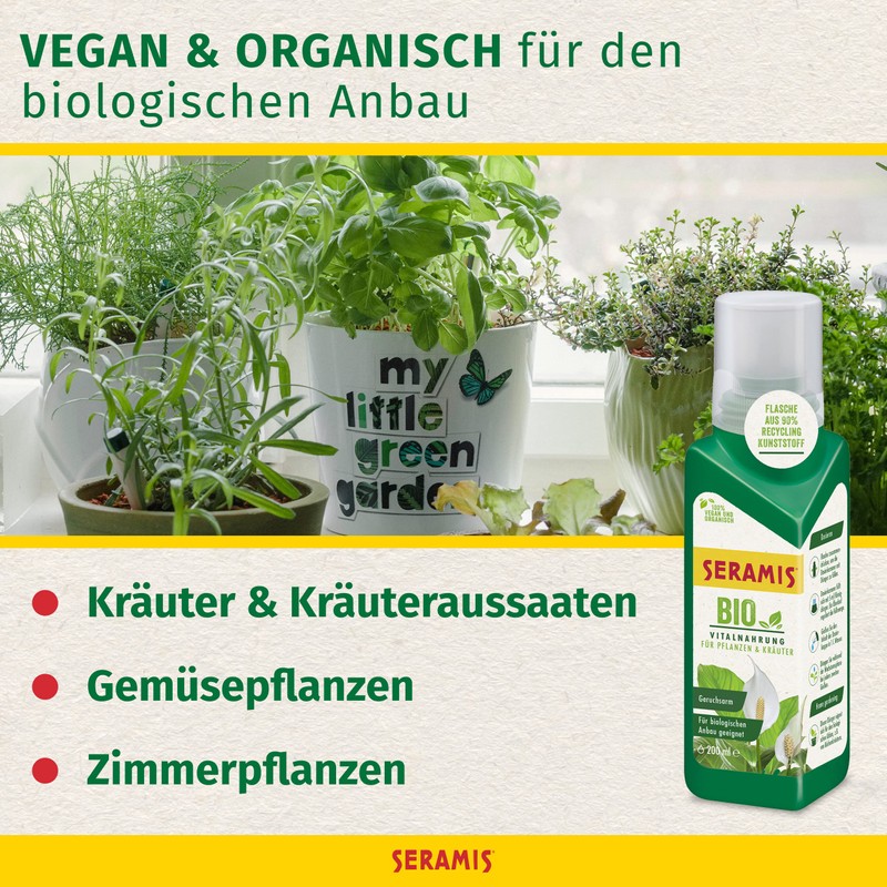 - Lieferumfang & Hinweis – Seramis Bio-Vitalnahrung für Pflanzen und Kräuter in der 200 ml Flasche mit Dosierkappe. Die Verpackung vom Kräuter-Dünger ist aus 90 % recyceltem Kunststoff. Art.-Nr.: 734961.