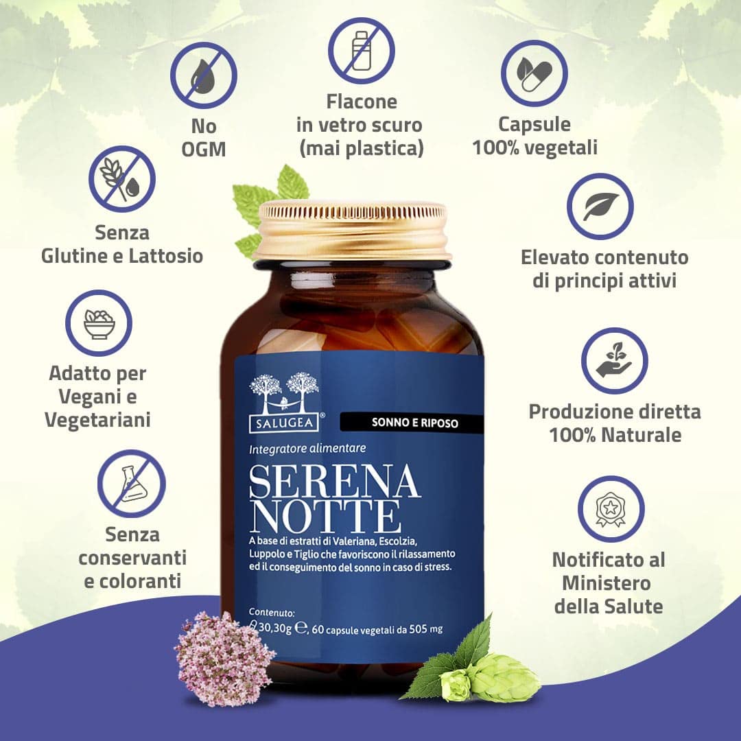 SERENA NIGHT Salugea - Supplement with Valerian - Against Insomnia - Improves Sleep Duration and Quality - 100% Natural with Valerian, Escolzia, Hops and Linden - 60 Vegetable Capsules