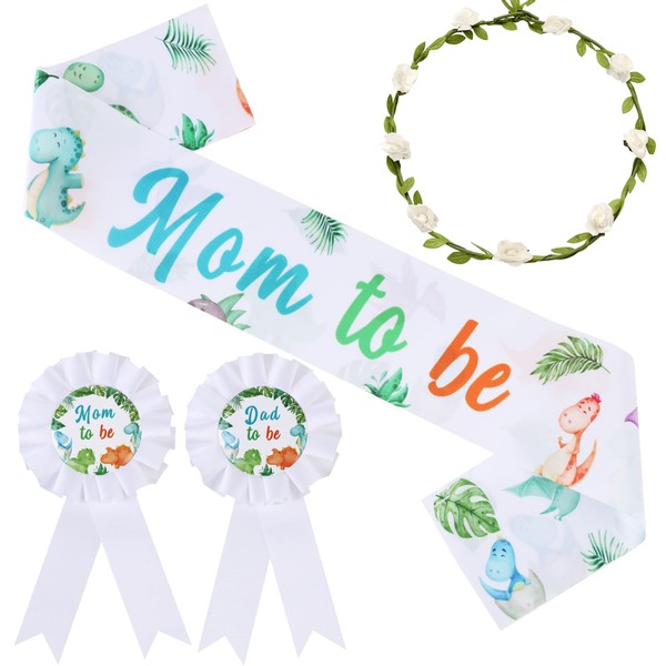 Dinosaur Baby Shower Decorations contains: 1 x mom to be sash 1 x mom to be pin 1 x dad to be pin 1 x flower crown headband