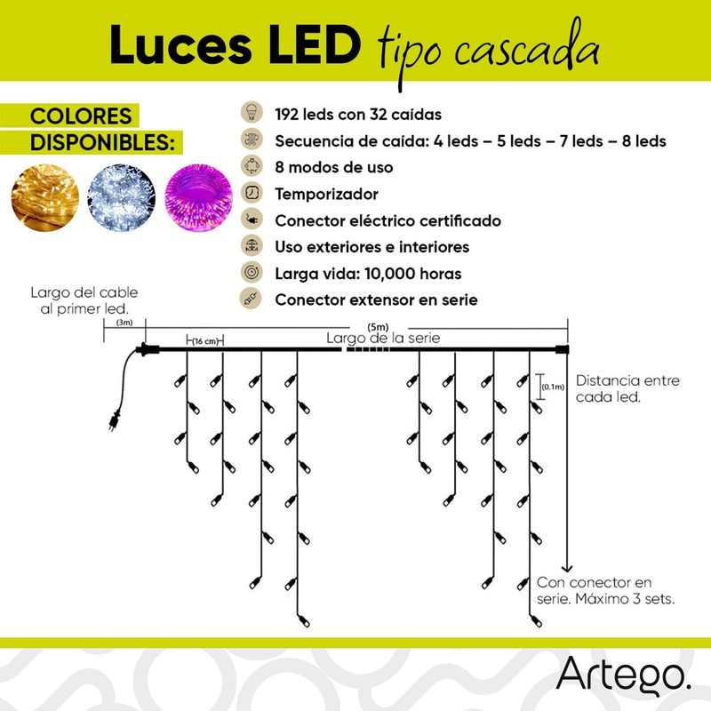 - **Número de caídas de la serie cascada: 32 en secuencia 4 leds, 5 leds, 7 leds y 8 leds.