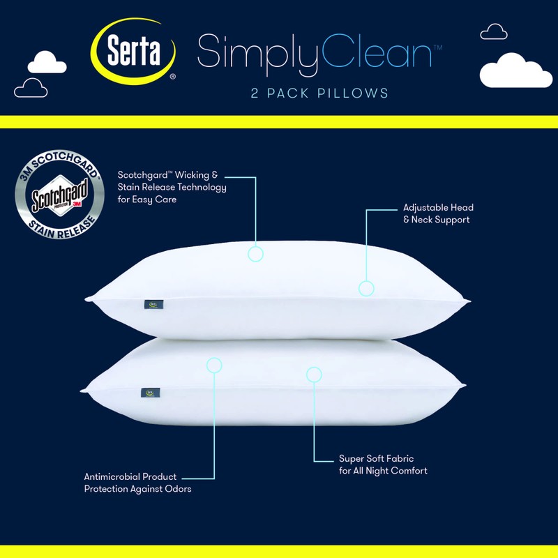 Serta Simply Clean Soft Stain-Resistant Down Alternative Soft/Medium Bed Pillows for Sleeping (2 Pack), King, White