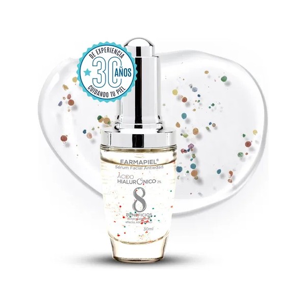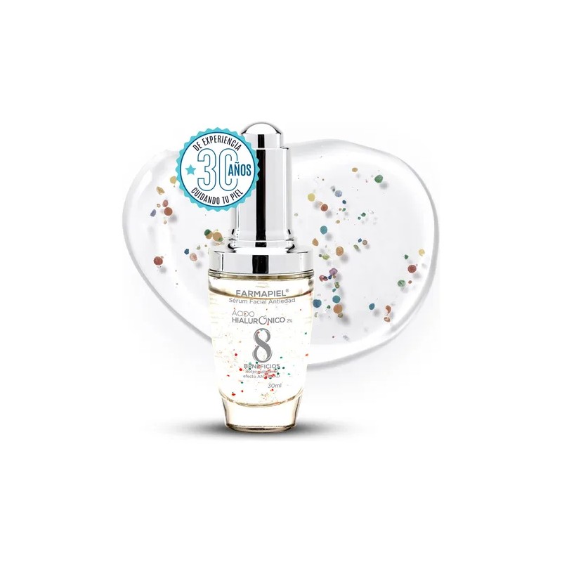 Título: Serum Antiedad Con 8 Tipos De Ácidos Hialurónicos Farmapiel 30 G con vitaminas A, C y E concentración 2% para todo tipo de piel día/noche