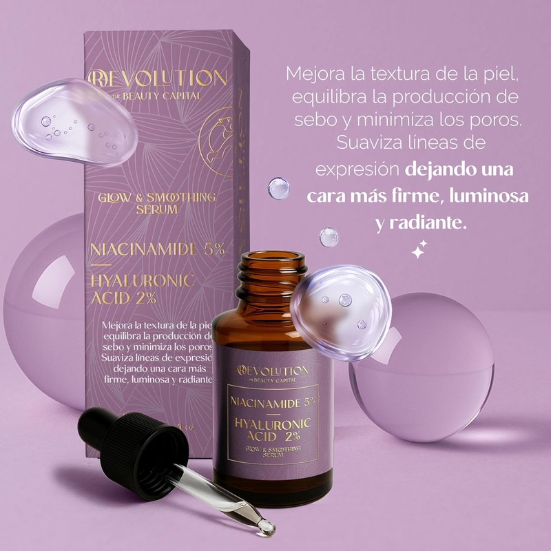 - NIACINAMIDA 5% - Alisa tu piel, regula la producción de sebo y controla el brillo facial. Potenciado con ácido hialurónico que hidrata profundamente.