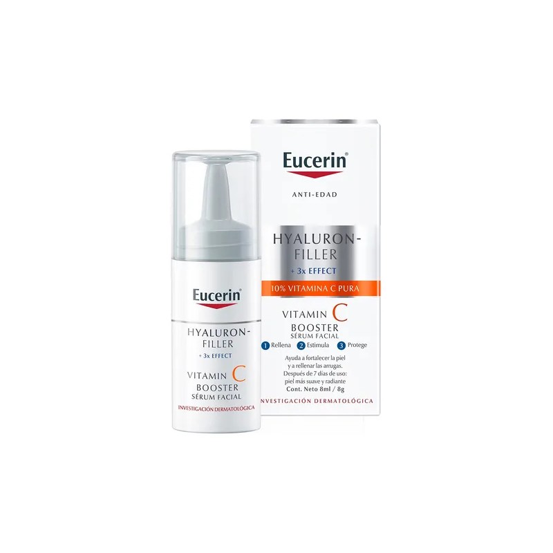 El sol, la contaminación, el tabaco y otros aspectos de nuestra vida diaria promueven la formación de radicales libres. Los radicales libres causan estrés oxidativo en la piel, aceleran el envejecimiento prematuro y contribuyendo a un aspecto apagado en la piel. Eucerin Hyaluron-Filler Vitamin C Booster con un 10 % de vitamina C, se ha formulado especialmente para prevenir el daño causado por los radicales libres y para tratar los primeros signos del envejecimiento: fortalece la piel, rellena las arrugas y proporcionar un aspecto más suave, fresco y radiante.