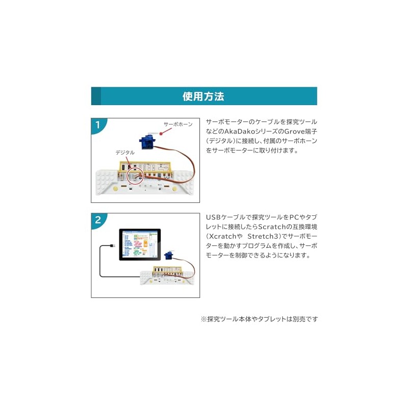 - Servo motor connects to Grove terminals. Connect to the AkaDako series and control Scratch (compatible environment Xcratch or Stretch3)
