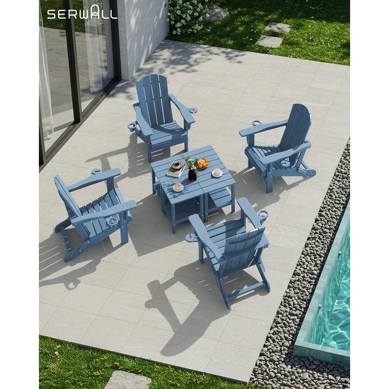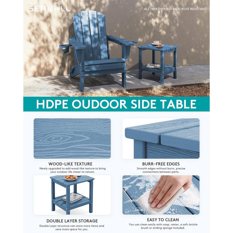 - Maintenance-Free - SERWALL double-layer adirondack tables are made of weather-resistant high-density polyethylene (HDPE) with a non-porous surface that resists staining and can be rinsed with water to keep it looking new. Unlike wood furniture, it requires no painting, sealing or seasonal maintenance.