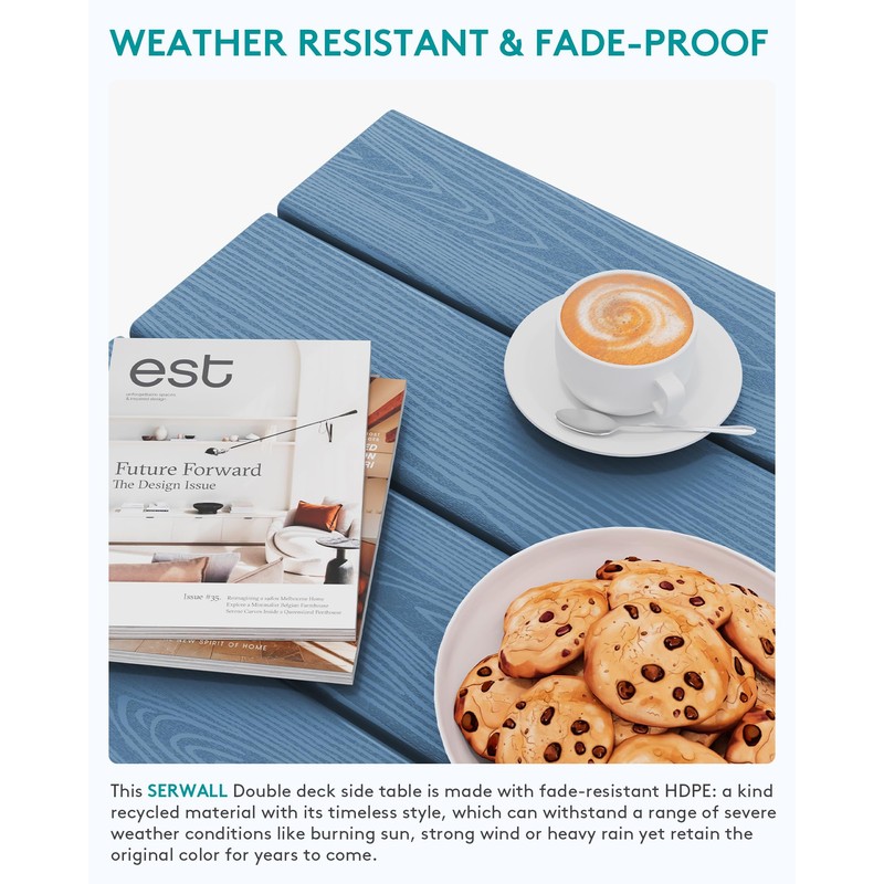 - Double-Deck Convenience - SERWALL outdoor side table features dual shelves for 2X storage space. The upper deck (220-lb capacity) holds drinks & serving trays, while the lower shelf (80-lb capacity) stores books or accessories. Heavy-duty HDPE construction withstands all weather.