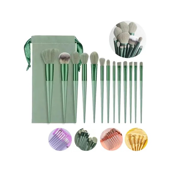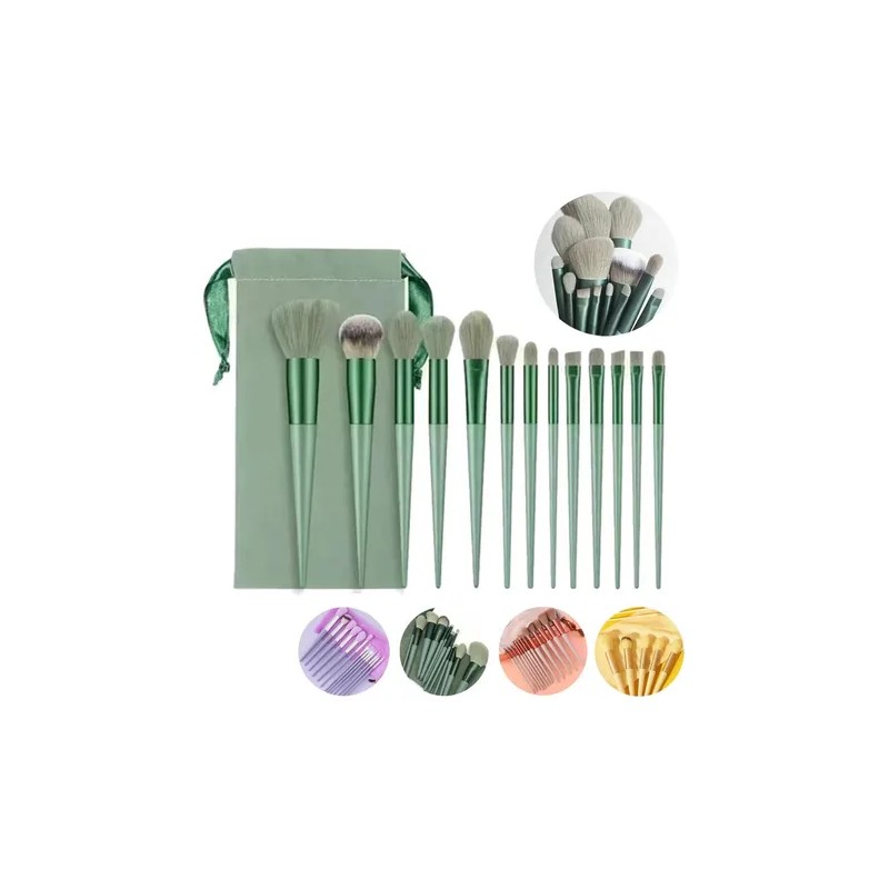 Set Brochas de maquillaje 13 piezas profesional y bolsa verde color MLFUO