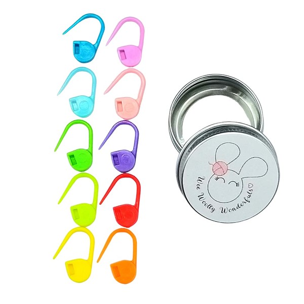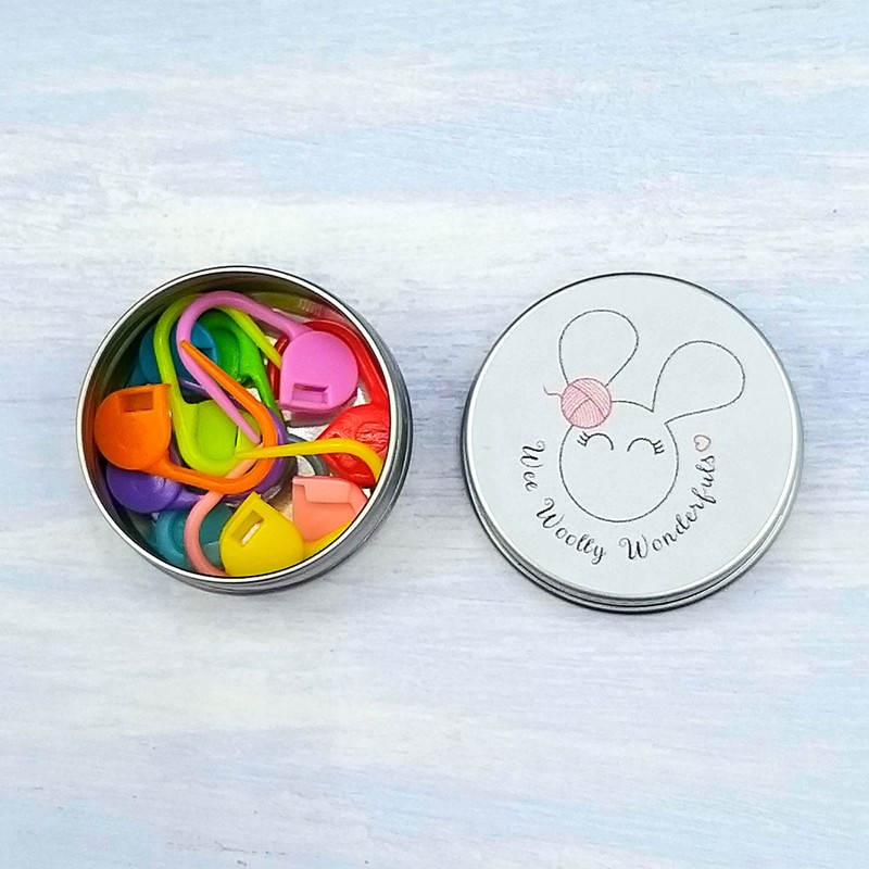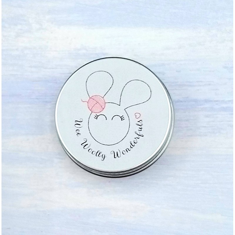 This sweet little silver screw top tin, is perfect for keeping your Stitch Markers safe in your project bag! The tin has our cute Wee Woolly Wonderfuls cute bunny sticker on the lid, and contains 10 brightly coloured locking plastic stitch markers.