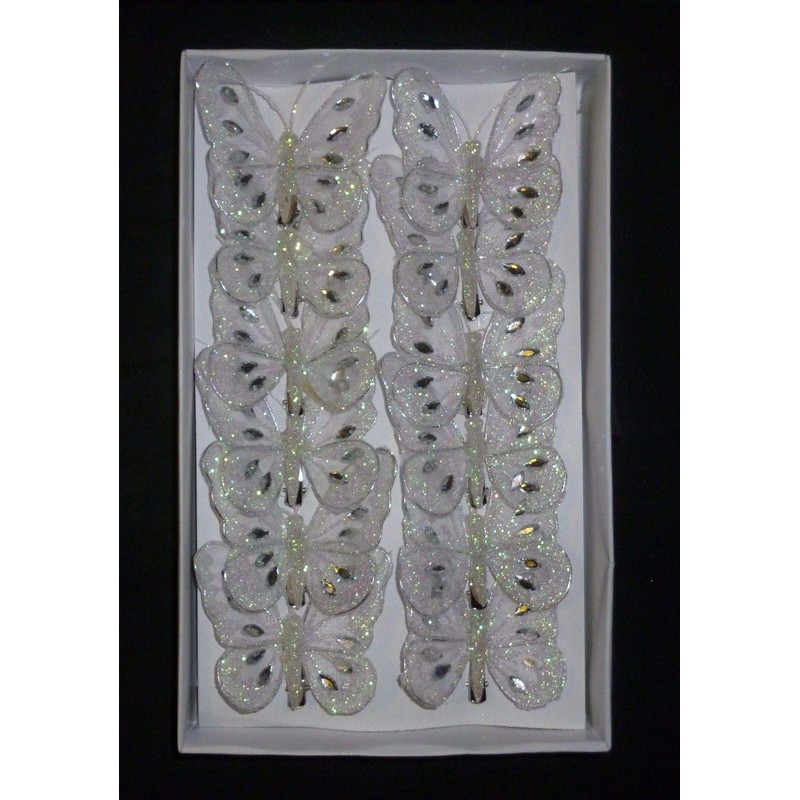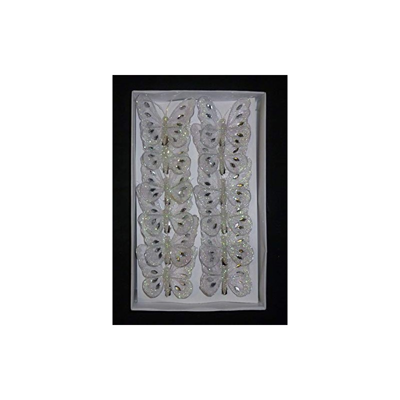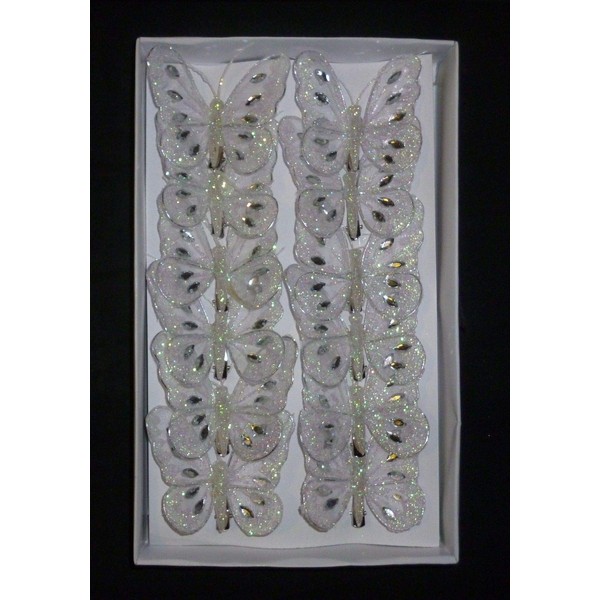 SET OF 12 Clip On Jewelled Glitter Mesh Decorative Butterflies 8cm (White)