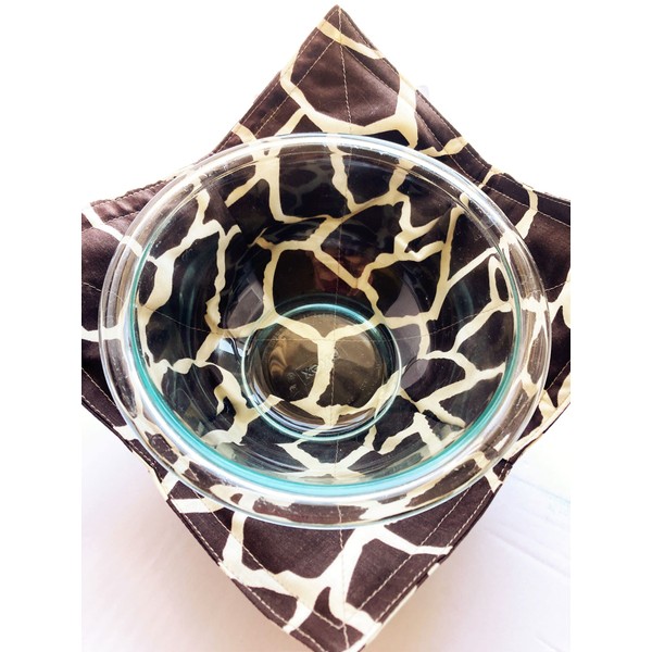 Set of 2 Bowl Cozies - Giraffe Cotton Print - aka Microwave Hot Pads aka Bowl Oven Mitts - 8.5 inches for up to 8 inch bowls - Brown & Beige Animal Print