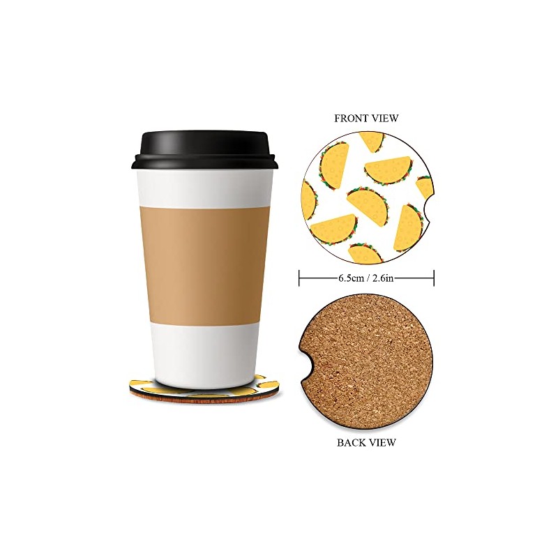 Set of 2, Car Coasters, Tacos Mexican Food Pattern, Absorbent Cork Base Round Car Drinks Cup Holder Coaster
