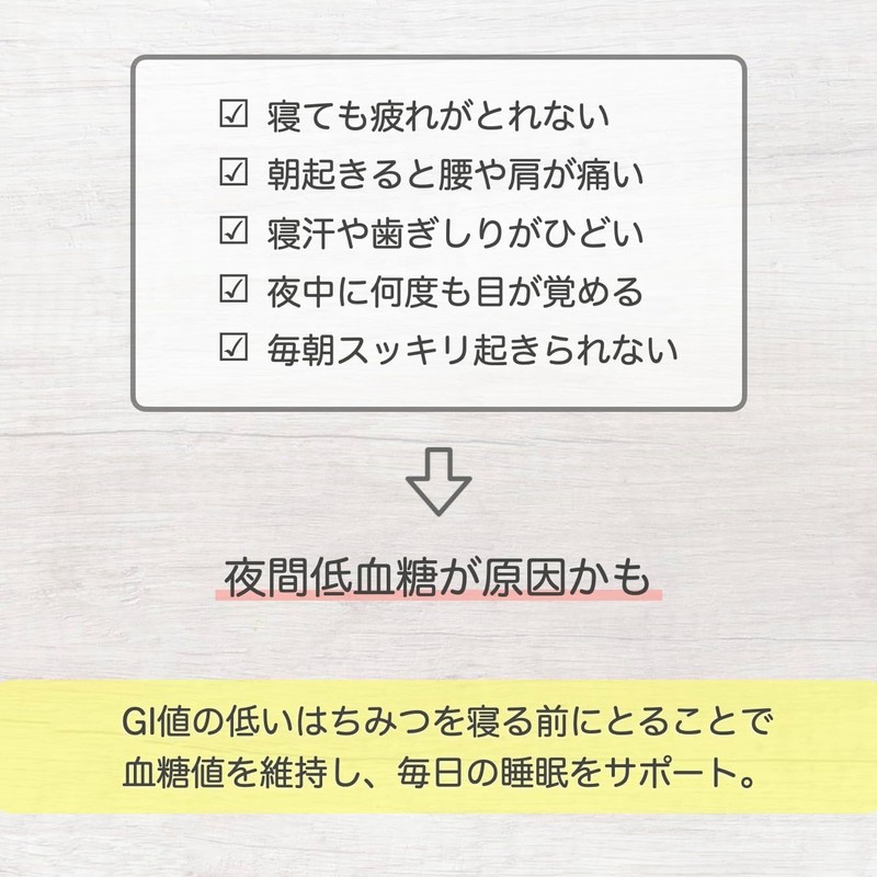 - Supports a good night's sleep with a low GI honey, which is one of the causes of stiff shoulders, lower back pain, night sweating, and shallow sleeping