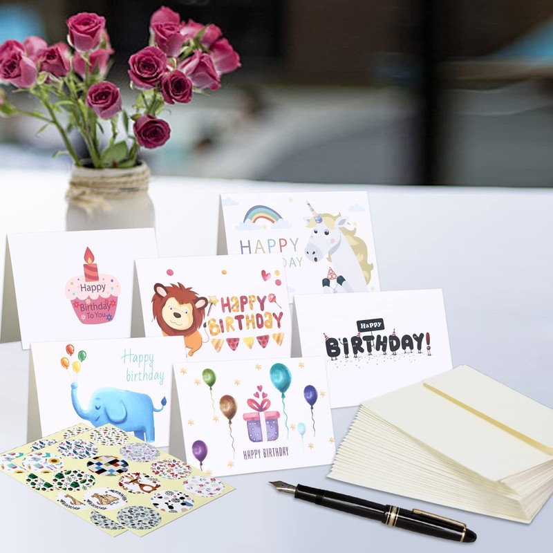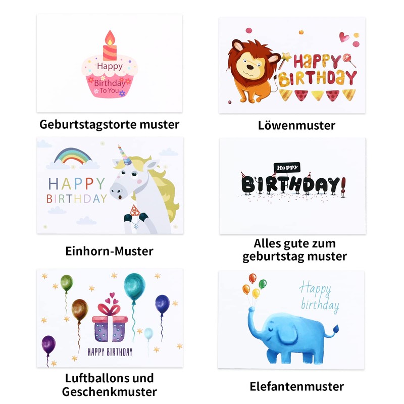 · Each card is printed with a different pattern. Also includes: unicorn, elephant, gift box, balloon, lion, creative birthday. 6 cards for each pattern, 6 different patterns to choose from.