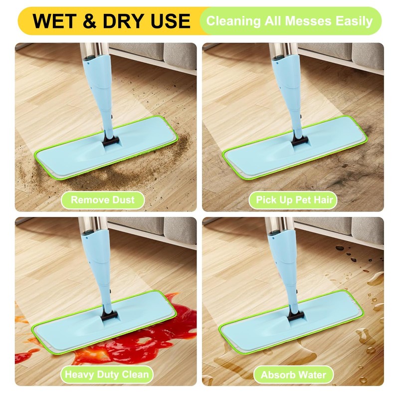 • SUPERFINE MICROFIBER - Our spray mop heads adopt the high quality microfiber whose decontamination ability is further improved, fully absorb pet fur, hair, debris, dust, oil or other stubborn stain, durable and reusable.