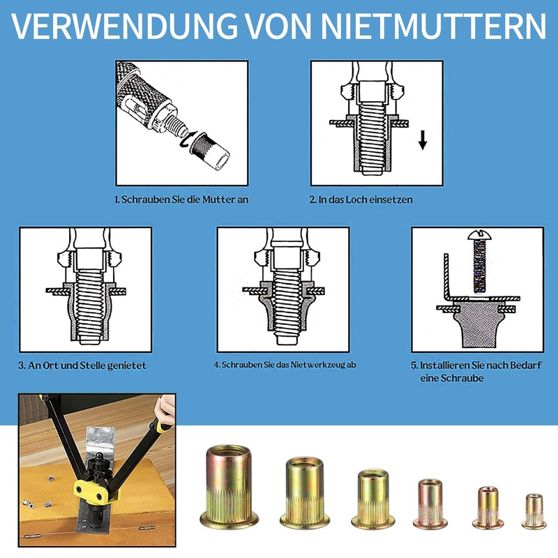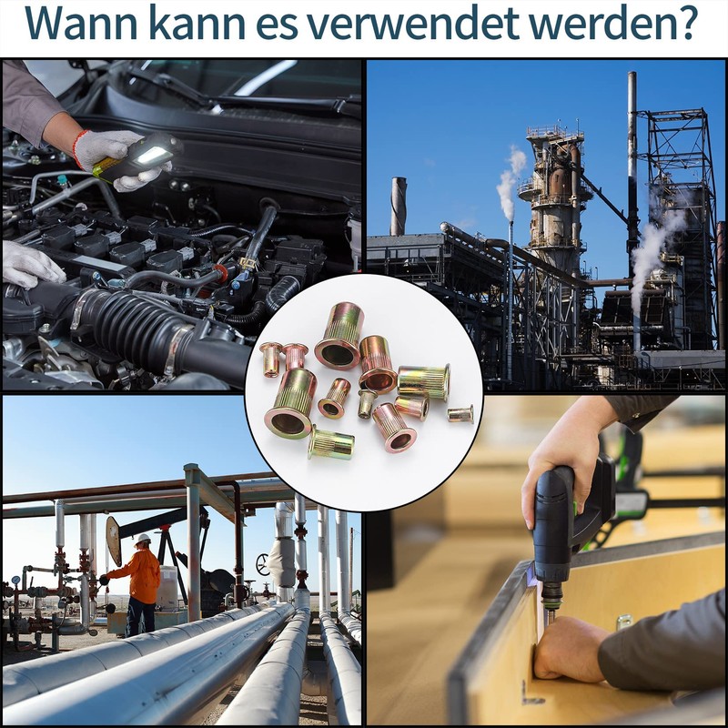 - Wide applications: the blind rivet nuts set is ideal for automobiles, decorations, metal plates, wood, handmade products, furniture, other industrial products, electrical appliances, etc.