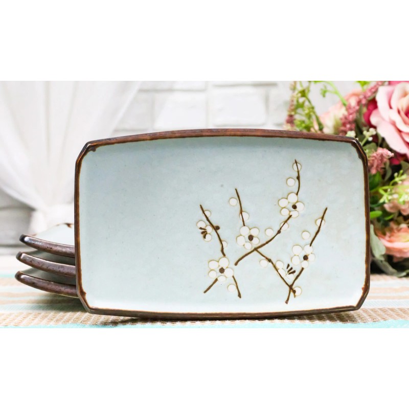 • This set is made in a state of the art factory Japan. Dishwasher and Microwave Safe. Each dinnerware has a lovely soft and creamy duck-egg greeny-blue glaze and a simple brown and white cherry blossom design!