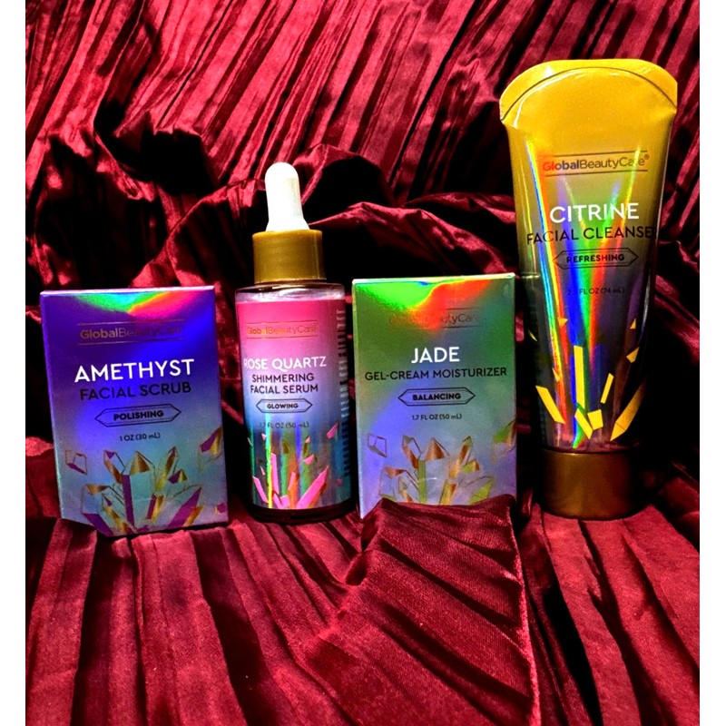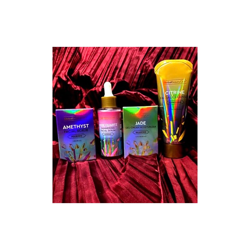 - COMPLETE SET: Four-piece skincare collection featuring Citrine Cleanser, Amethyst Scrub, Rose Quartz Serum, and Jade Gel/Cream Moisturizer