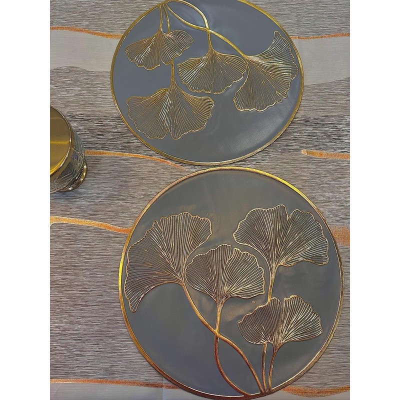 Set of 6 Place Mats PVC Table Mats Heat Resistant Non-Slip Washable Placemats for Dining Table, Kitchen, Party – 38cm Round 3D Embossed Ginkgo Leaf Design (Grey Gold)