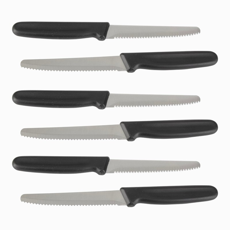 Set of 6 stainless steel blade and handle made of robust plastic. Sharp serrated blade with optimal length of approx. 10.5 cm. Total length 21 cm