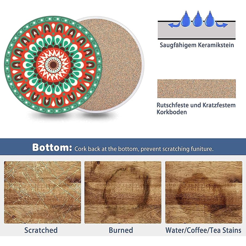 - Anti-scratch Cork Backing, Easy to Clean The back of the coasters is pressed from high density cork, friendly to wooden tables or other furniture, prevent scratching and wear of furniture. Non-slip cork underlay, strong heat insulation, easy to clean, simply rinse with water, spills can be easily wiped off with a damp cloth.