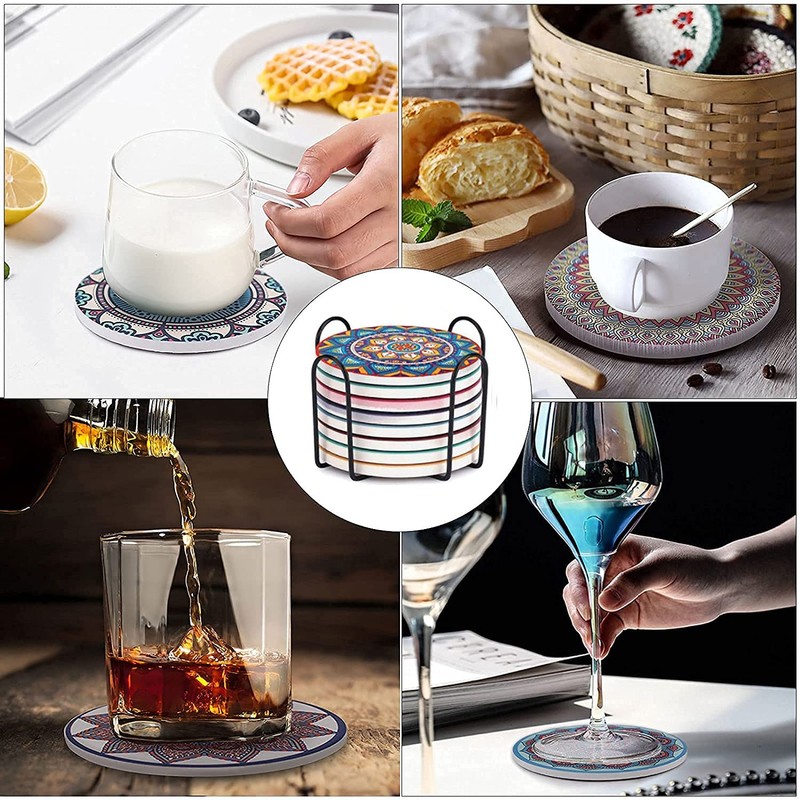 - Package Content Includes 8 different types of round ceramic stone coasters. Includes a black iron coaster rack to store your coasters and save space. Impress your family and friends with this stunning set of cork coasters in a decorative gift box.