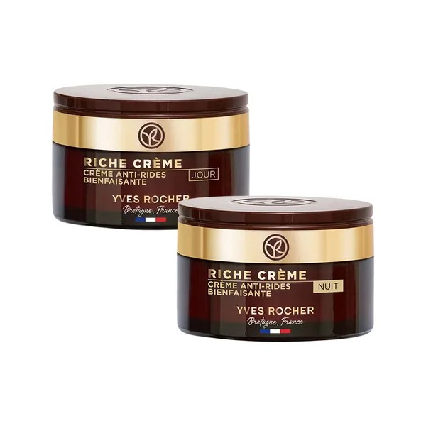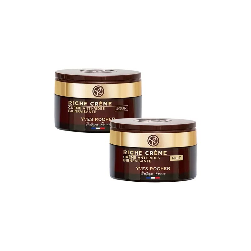 Este Set consta de 2 cremas de la linea Riche Creme de Yves Rocher, una Crema Facial de Día Nutri Regeneradora y una Crema Facial de Noche Nutri Regeneradora.