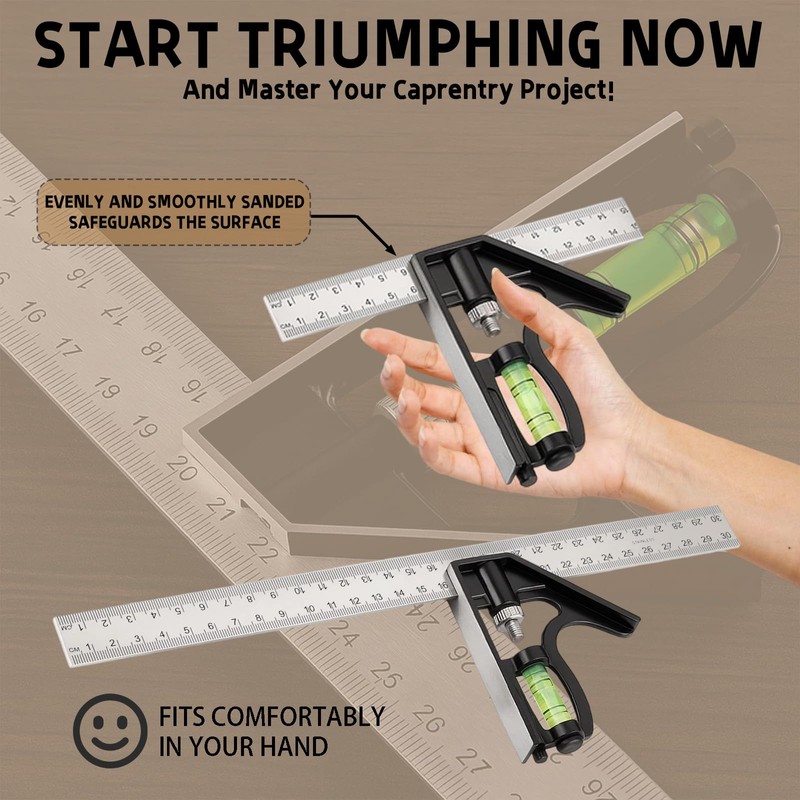 • 【Ergonomic Design】: The adjustable set square features a smooth sliding mechanism for quick measurements; The comfortable grip and integrated scribe make marking lines efficient and hassle-free