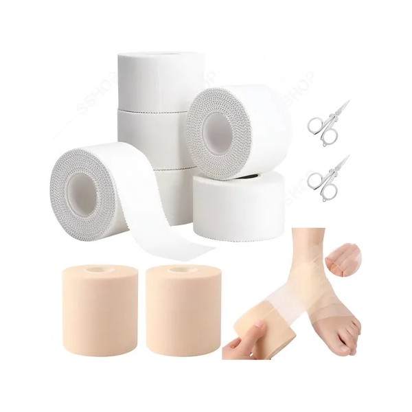 Kit de vendaje funcional: 2 Bajo Venda , 7cm x 27m. 6Tapes funcionales: 3.8cm x 13.7m. Tela adhesiva deportiva 100% algodón con oxido de zinc para resistencia y estabilidad. Adhesivo fuerte, sin látex, desenrollado fácil. Color: blanco.