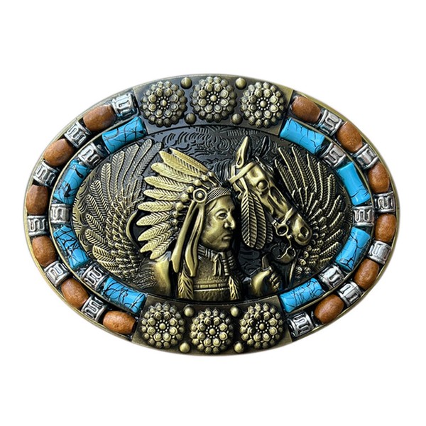 Seternaly Bull Skull Belt Buckle Horse Hat Native American Belt Buckle Turquoise Wooden Beads Decorated Belt Buckles for Men Women, Native-008, 3.94*2.91 in