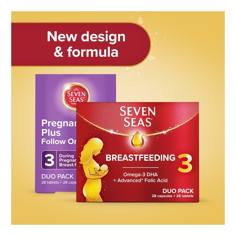 Seven Seas Breastfeeding is a postnatal pregnancy supplement that supports the healthy development of your baby's brain and vision with Omega-3 DHA¹. It is formulated with an advanced* form of Folic Acid, Iron, Vitamin B6, Vitamin B12, Zinc, Vitamin D, Calcium, and further expertly selected nutrients to support you during breastfeeding. Vitamin B6 and Iron support your energy², while Vitamin B12 and Folic Acid help reduce tiredness and fatigue5, and Calcium contributes to the formation of normal bones.³ Duo pack containing 28 capsules and 28 tablets (4 weeks' supply). Take 1 capsule and 1 tablet daily with water during a meal. Gluten-free, lactose-free, no GMOs. Food supplements are not intended as a substitute for a varied and balanced diet and healthy lifestyle.